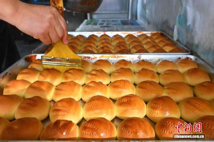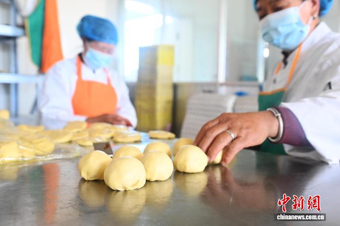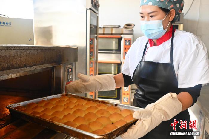 9月23日,在位于甘肃省嘉峪关市文殊镇塔湾村嘉农殊味农民专业合作社内,工作人员展示烤制好的中秋烧壳子。中新社记者 李亚龙 摄